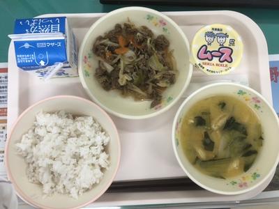 「麦ご飯、牛乳、みそ汁、あか牛の焼肉風炒め、ムース」でした。