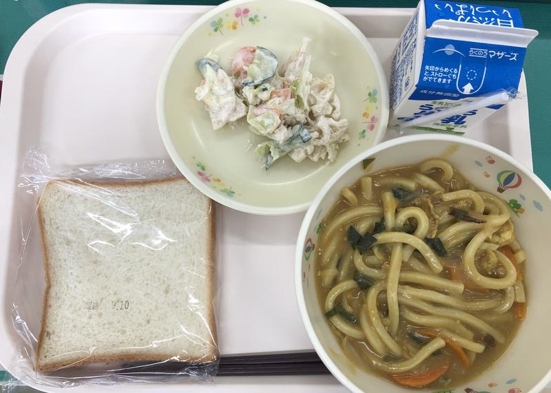 9月11日の給食は「食パン、牛乳、カレーうどん、根菜サラダ」でした。