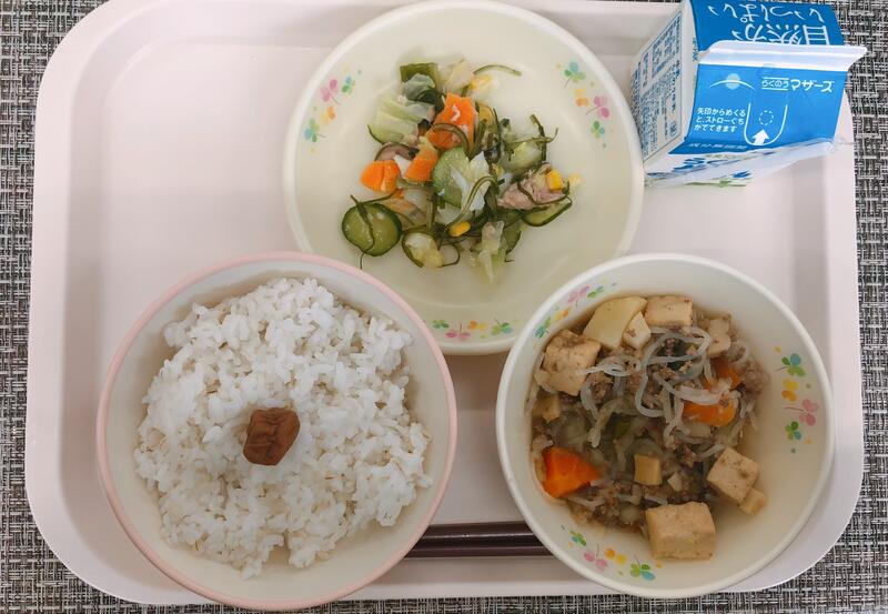 5月12日の給食は「麦ご飯、牛乳、じゃがいものそぼろ煮、海藻サラダ、梅干し」でした。