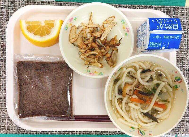 5月13日の給食は「ココアパン、牛乳、山菜うどん、カミカミごぼう、ばんかん」でした。