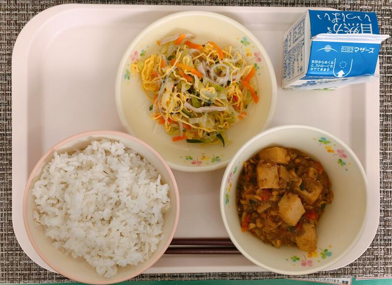 5月16日の給食は「麦ごはん、牛乳、カレーマーボー厚揚げ、バンサンスー」でした。