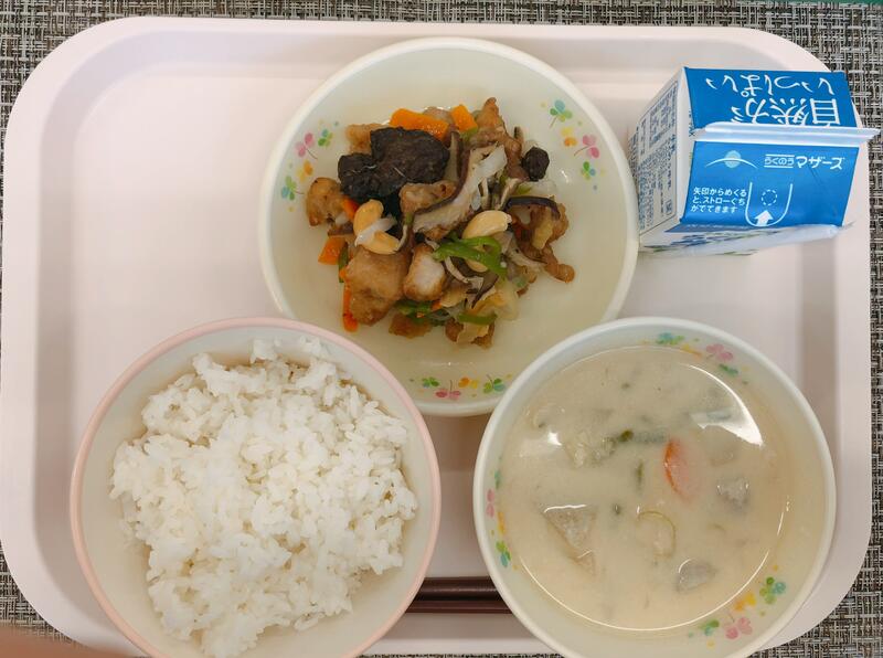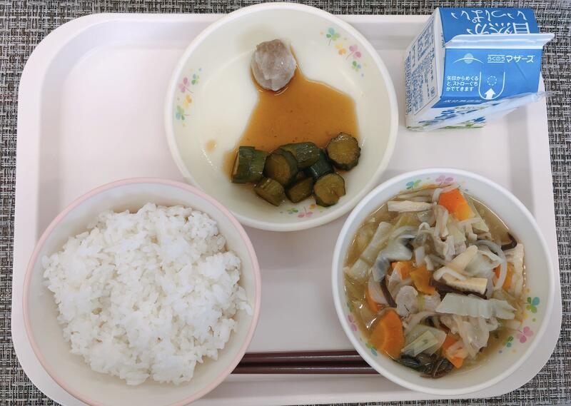5月27日の給食は「ごはん、牛乳、八宝菜、肥後しゅうまい、きゅうりのカリカリ漬」でした。