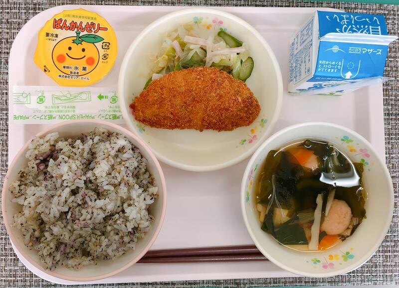 5月19日の給食は「茶飯、牛乳、つみれのすまし汁、かつおフライ、サラ玉サラダ、ばんかんゼリー」でした。