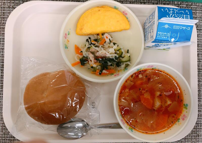 5月20日の給食は「米粉パン、牛乳、ミネストローネ、オムレツ、切り干し大根サラダ」でした。