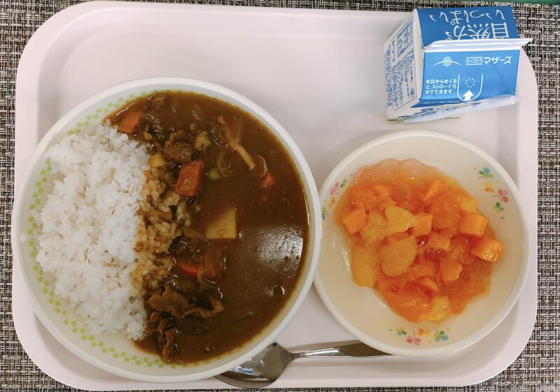 5月21日の給食は「カレーライス、牛乳、フルーツミックス」でした。