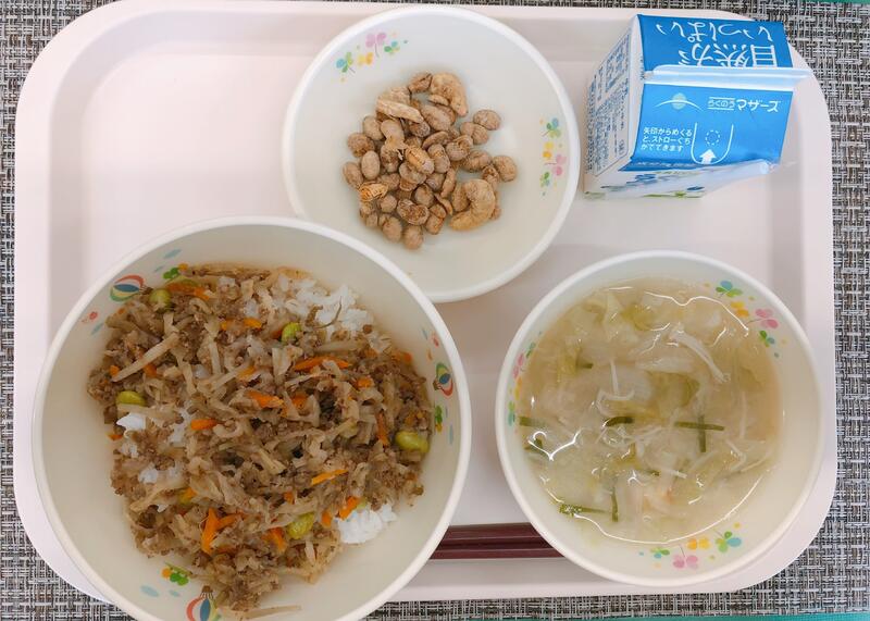 5月25日の給食は「シャキシャキそぼろ丼、牛乳、キャベツのみそ汁、りんかけ豆」でした。