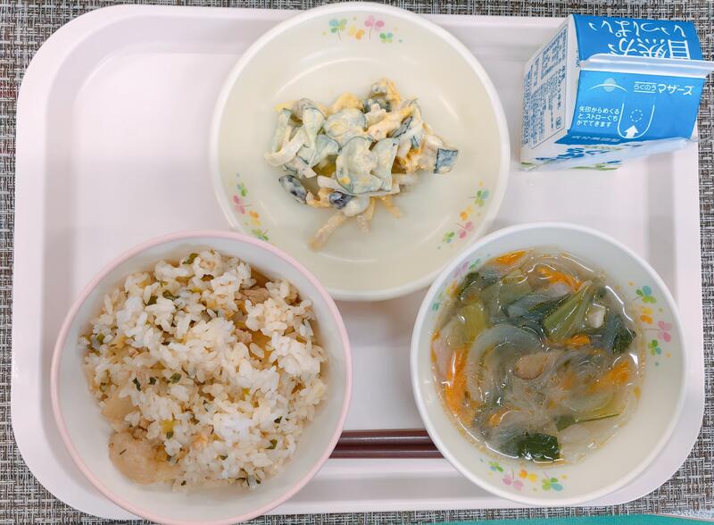 今日は旬のグリンピースを使った混ぜごはんでした。風味がよくてとても美味しく仕上がりました。食べやすいように鶏そぼろも入っていました。高野豆腐も一緒に入っていましたが、気づいた人はいましたでしょうか?