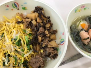 今日の献立「ピースそぼろごはん 牛乳 のっぺい汁 ひじきのマヨサラダ」でした。