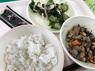 タコ、きゅうり、わかめの歯ごたえがとてもよかったです。磯煮の大豆もやわらかく食べやすかったです。味付けもおいしくごはんと合いました。(事務の先生)