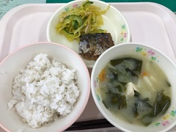 今日の献立「麦ごはん 牛乳 みそ汁 さばのソース煮 もやしのカレー和え」