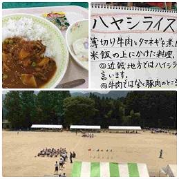 体育大会の予行練習で頑張った生徒にとってハヤシライスは最高のごほうびですネ!!フルーツヨーグルトもさっぱりしていてとてもおいしかったです。(校長先生)