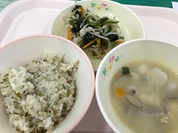 粉ものと豆、生徒たちの健康のバランスをしっかりと考えてあるメニューでした。豆といりこをかみ過ぎて顎が痛くなりました。(校長先生)