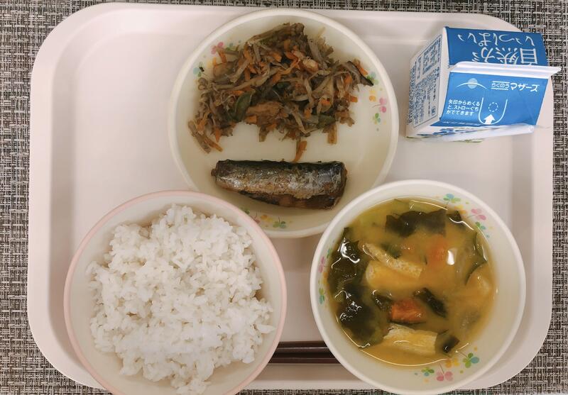 5月9日の給食は「ごはん、牛乳、かぼちゃのみそ汁、いわしの梅煮、きんぴらごぼう」でした。
