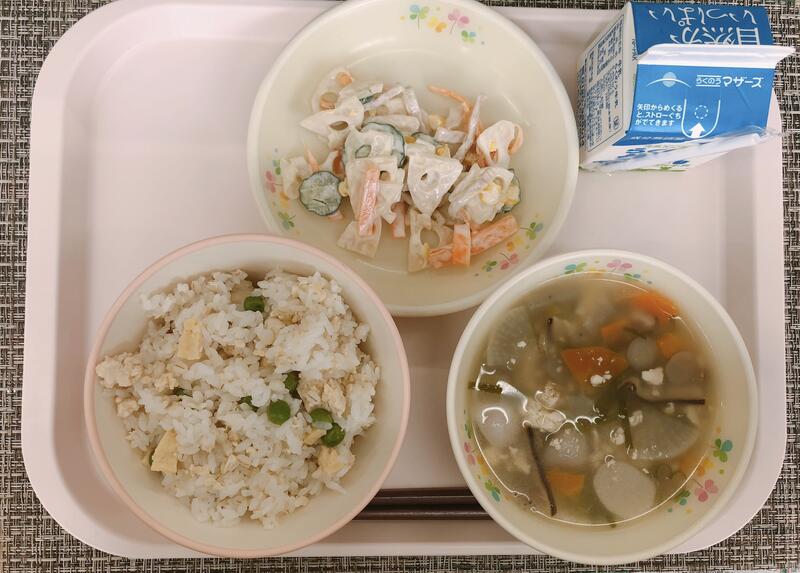5月10日の給食は「ピースそぼろごはん、牛乳、けんちん汁、れんこんサラダ」でした。
