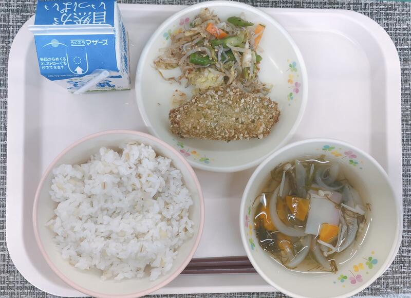 5月11日の給食は「麦ごはん、牛乳、もずくのすまし汁、ホキの天玉揚げ、アスパラのおかか和え」でした。