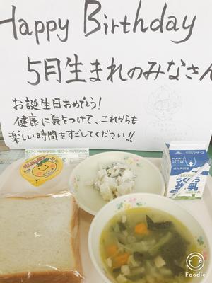 Happy Birthday!! 5月生まれのみなさん! 投稿日時 : 2019/05/27 投稿者6 今日は5月生まれのみなさんをお祝いする給食でした。 喜んで食べていました♪ 献立「食パン 牛乳 野菜スープ ポテトサラダ お誕生日デザート」