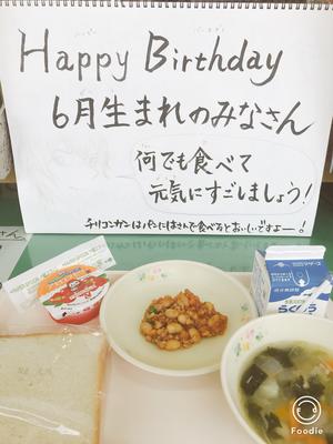 6月生まれのみなさん!お誕生日おめでとうございます!! 投稿日時 : 2019/06/17 投稿者6 今日は6月生まれのみなさんをお祝いする給食でした。 チリコンカンは大豆たっぷりでしたが、思った以上によく食べていました。 献立「食パン 牛乳 ラビオリスープ チリコンカン お誕生日デザート」
