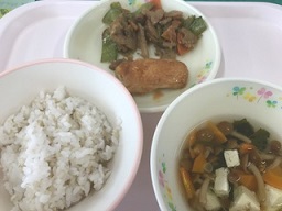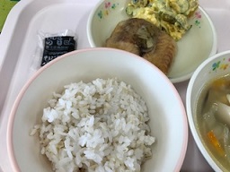献立「麦ごはん 牛乳 なめこ汁 鶏肉のケチャップかけ れんこんきんぴら」