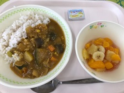 献立「夏野菜のカレー 牛乳 フルーツミックス チーズ」
