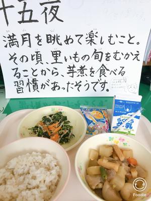 献立「麦ご飯 牛乳 いかと里芋の煮物 ピーナツ和え 十五夜セレクト」