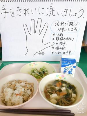 献立「キムタクごはん 牛乳 もずくのスープ ごぼうサラダ」