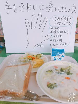 「食パン 牛乳 クリームシチュー オムレツ アーモンド入りサラダ」