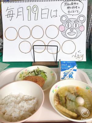 ふるさとくまさんデーということで、太平燕、馬肉を使ったコロッケにしました。