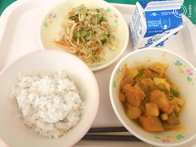 献立「麦ごはん 牛乳 かぼちゃのそぼろ煮 かみんこサラダ」