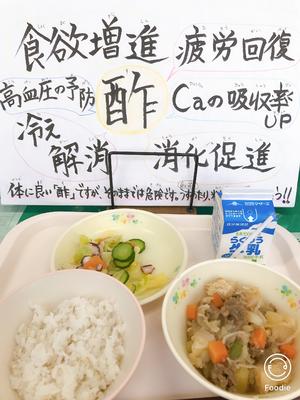 献立「麦ご飯 牛乳 あか牛の肉じゃが たこの酢の物」