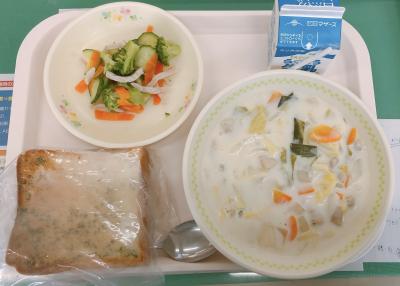 4月16日の給食は「チーズパセリトースト、牛乳、新キャベツのミルクスープ、ブロッコリーサラダ」でした。