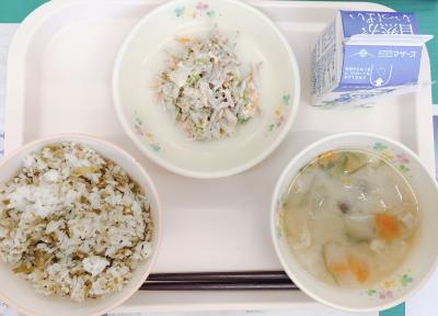 4月19日の給食は「高菜飯、牛乳、団子汁、ごぼうサラダ」でした。
