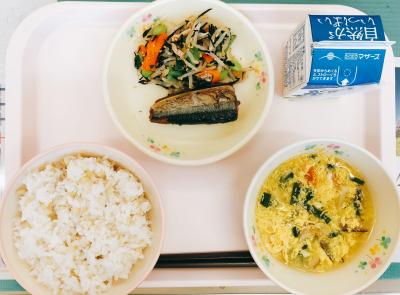 4月20日の給食は「麦ご飯、牛乳、にら玉汁、ひじきと枝豆のごま酢和え、さんまの甘露煮」でした。