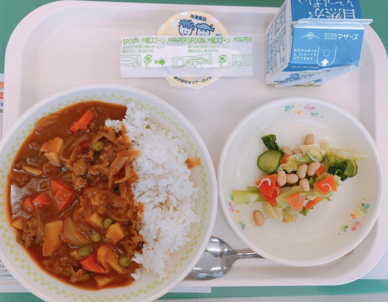 4月21日の給食は「ハヤシライス、牛乳、じゃこ豆サラダ、ムース」でした。