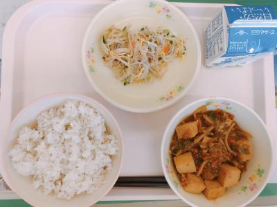 4月22日の給食は「麦ご飯、牛乳、麻婆厚揚げ、バンサンスー」でした。