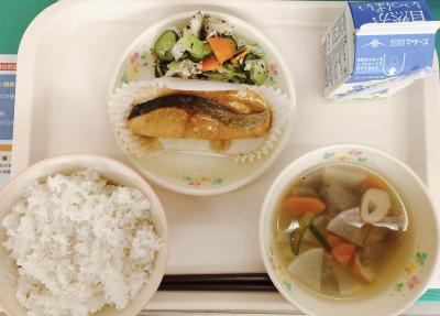 4月27日の給食は「麦ご飯、牛乳、たぬき汁、鮭のバター醤油焼き、ゆかりあえ」でした。