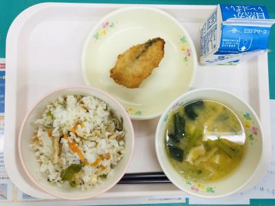 4月30日の給食は「筍ご飯、牛乳、味噌汁、さわらフライ」でした。
