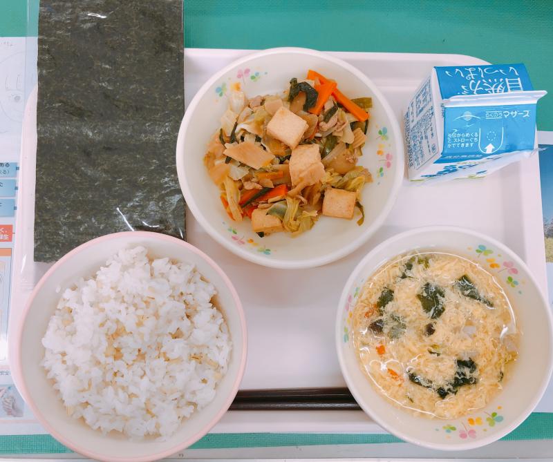 5月14日の給食は「麦ご飯、牛乳、かきたま汁、きゃべつと厚揚げの味噌炒め、焼きのり」でした。