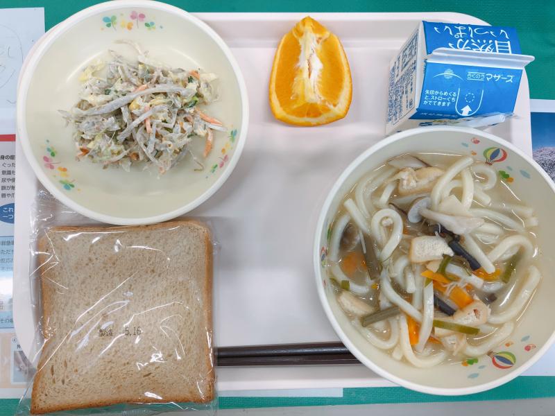 5月17日の給食は「黒糖パン、牛乳、山菜うどん、ごぼうのサラダ、オレンジ」です。