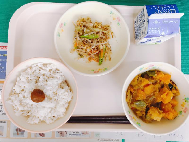5月18日の給食は「麦ご飯、牛乳、かぼちゃのそぼろ煮、アスパラのおかか和え、梅干し」でした。