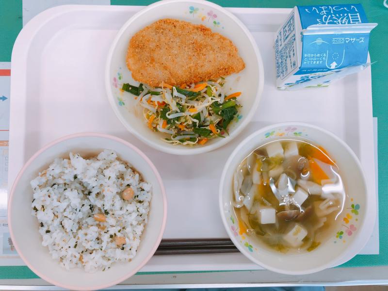 5月20日の給食は「大豆ご飯、牛乳、あおさのすまし汁、かつおフライ、ナムル」です。