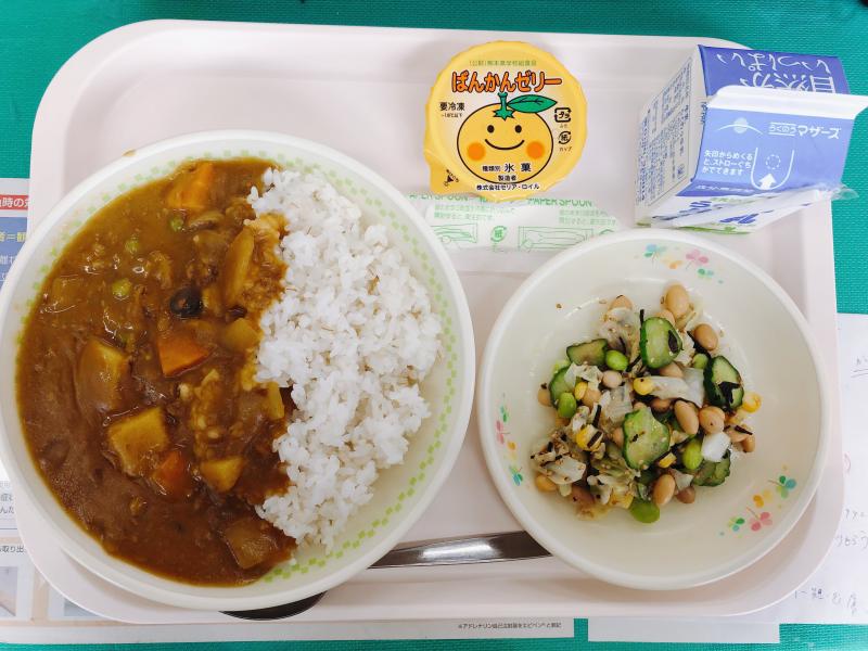 5月22日の給食は「カレーライス、牛乳、まめまめサラダ、ばんかんゼリー」でした。
