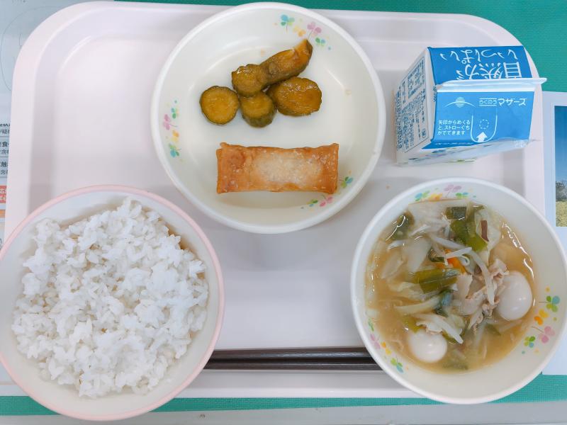5月27日の給食は「麦ご飯、牛乳、八宝菜、春巻き、きゅうりのカリカリ」でした。