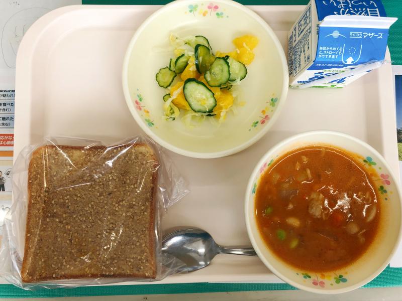 5月28日の給食は「セサミトースト、牛乳、ポークビーンズ、甘夏サラダ」でした。