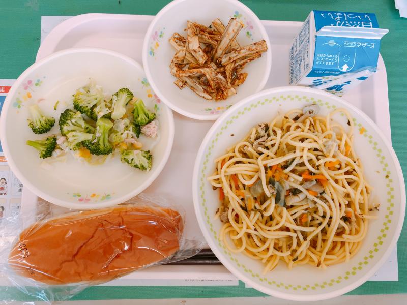 5月31日の給食は「ミルクパン、阿蘇高菜スパゲティ、カミカミゴボウ、ブロッコリーサラダ」でした。