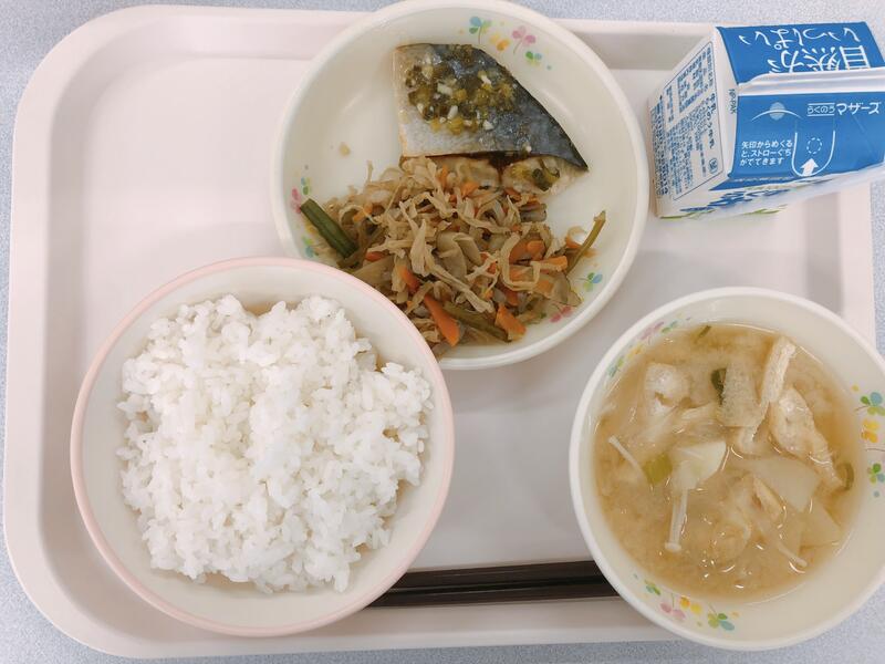 8月31日の給食は「白ご飯、牛乳、みそ汁、さばの香味焼き、切り干し大根のうま煮」でした。
