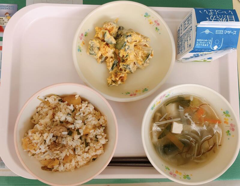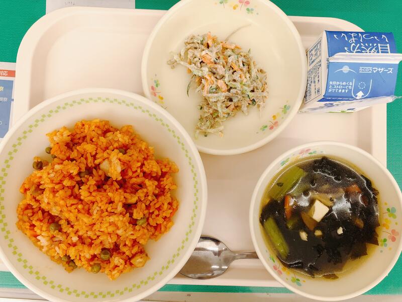 10月1日の給食は「チキンライス、牛乳て、わかめスープ、ごぼうサラダ」でした。