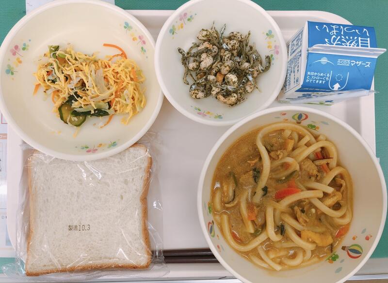 10月4日の給食は「食パン、牛乳、カレーうどん、五色和え、いりこと大豆の香りあえ」でした。