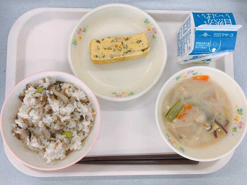 10月5日の給食は「きのこご飯、牛乳、さつまいものみそ汁、千草焼き」でした。