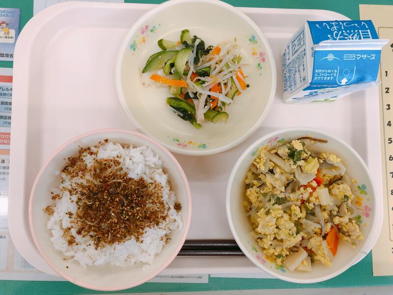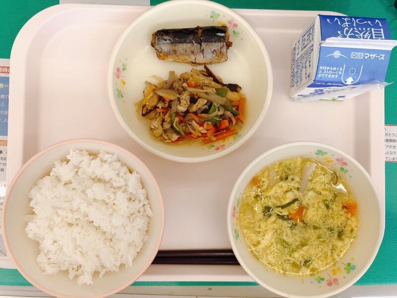 10月7日の給食は「白ご飯、かき玉汁、秋刀魚のおかか煮、切り干し大根のうま煮」でした。