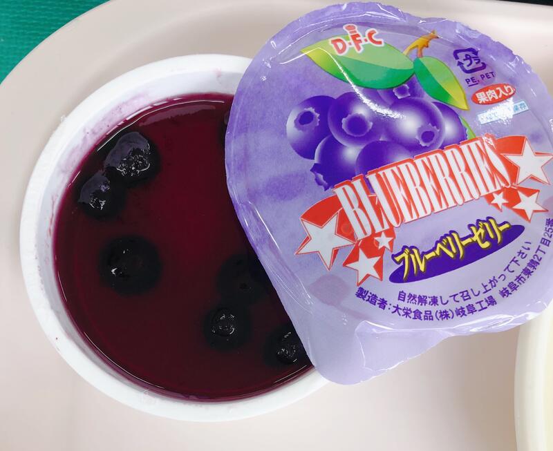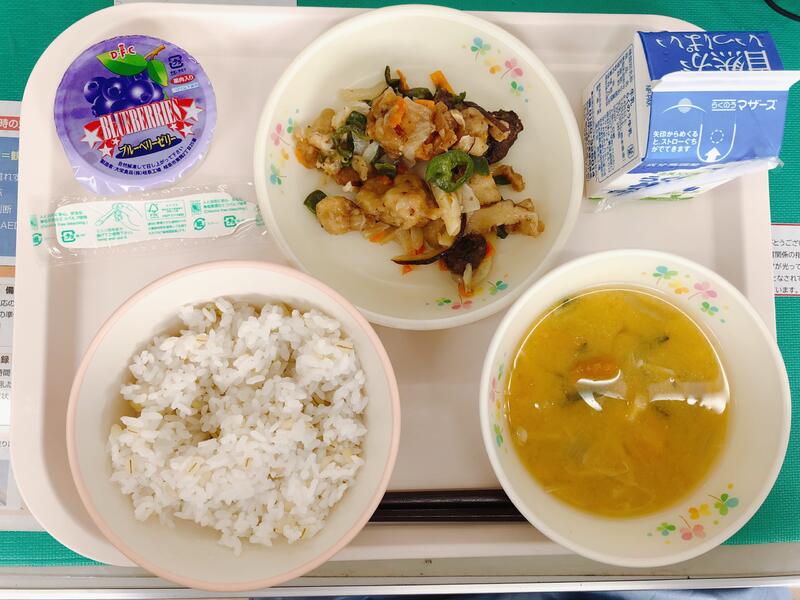 10月8日の給食は「麦ご飯、牛乳、みそ汁、元気が出るレバー、ブルーベリーゼリー」でした。